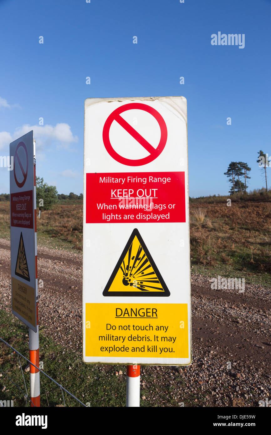 Warning signs on a military firing range at Ash Ranges, Surrey danger of unexploded bombs and