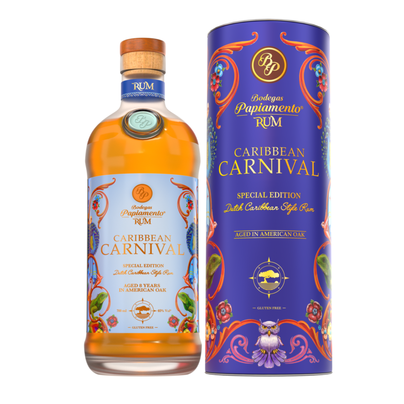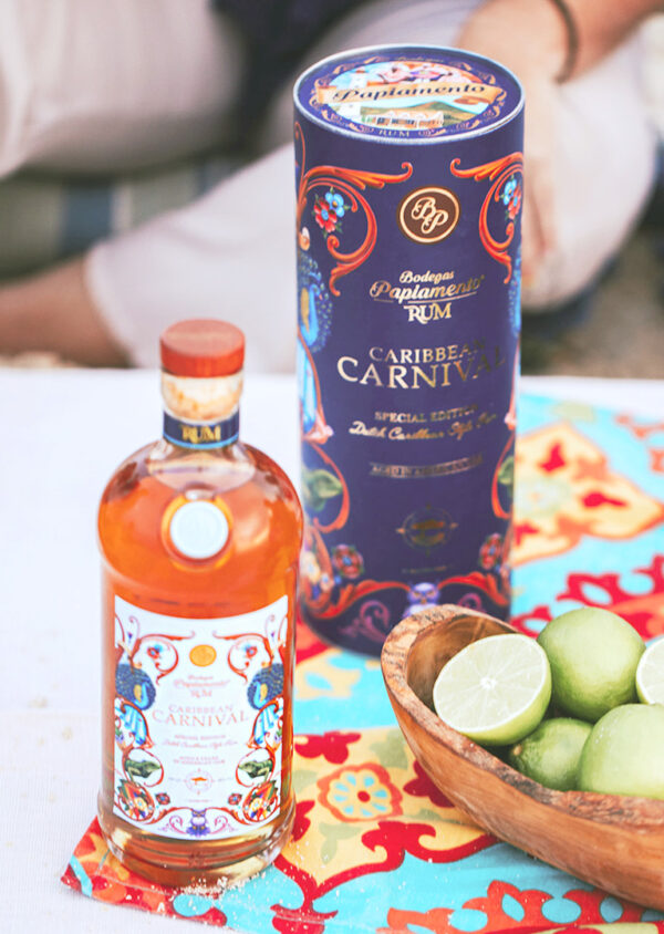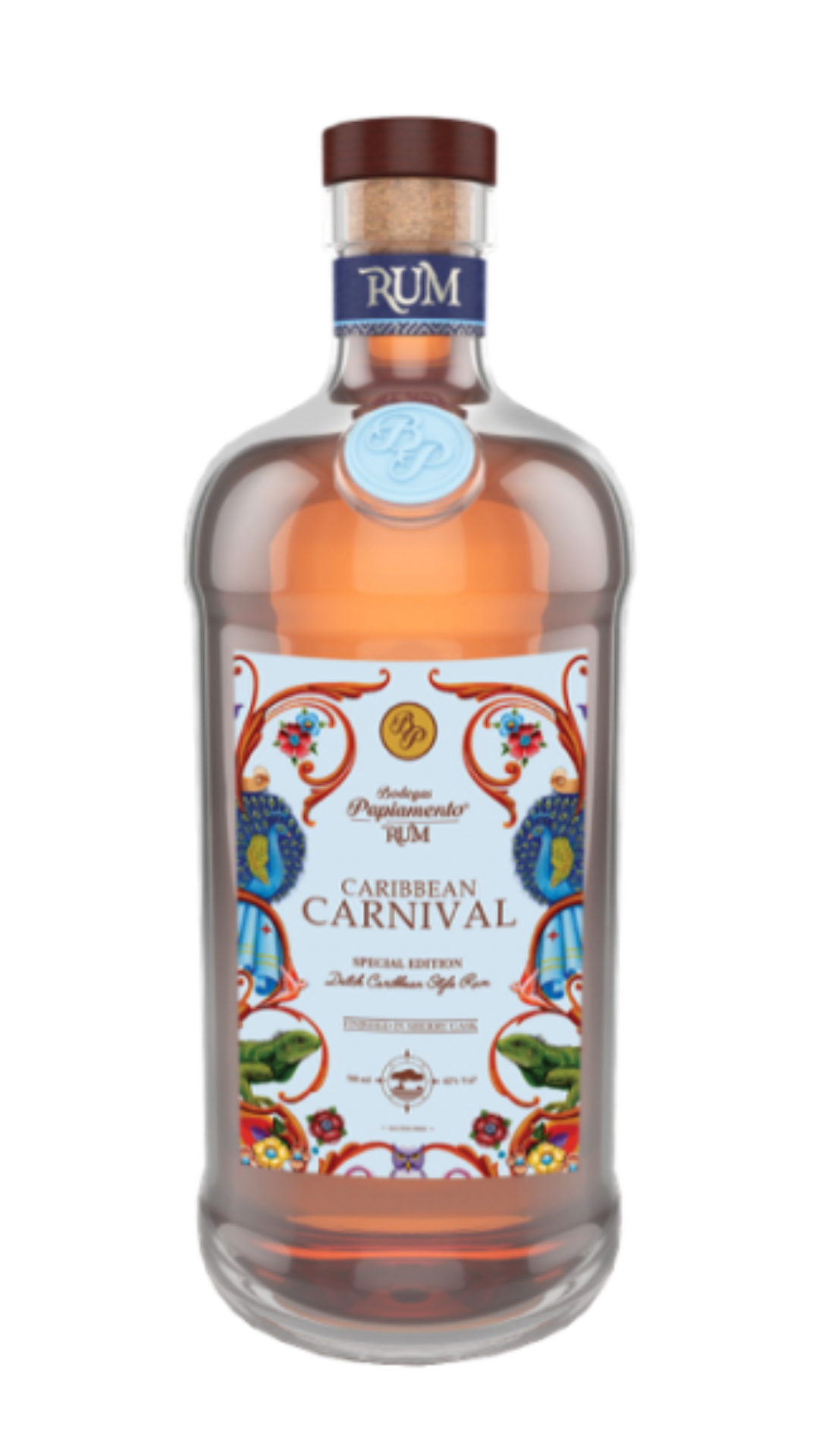 PAPRUMCARCARNI700ml. Introducing the Papiamento Caribbean Carnival Rum, a distinctive blend that captures the vibrant and festive atmosphere of the Caribbean in every sip. This limited edition rum has been aged for 8 years in a combination of old and new world barrels, creating a smooth and refined taste that's perfect for cocktails.