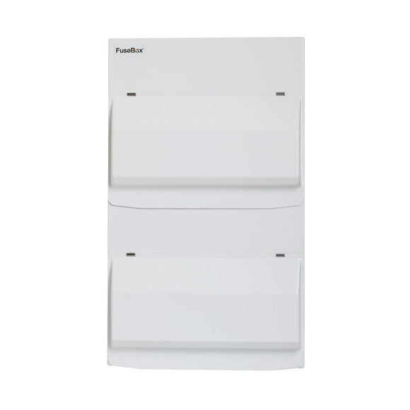 The Fusebox F2020MX is a white metal 20 way surge protected switch isolator consumer unit that offers a flexible versatile solution for residential installations. The Fusebox F2020MX is incredibly versatile and offers 20 usable ways , 100A double pole switch isolator and type 2 mini surge protection device.