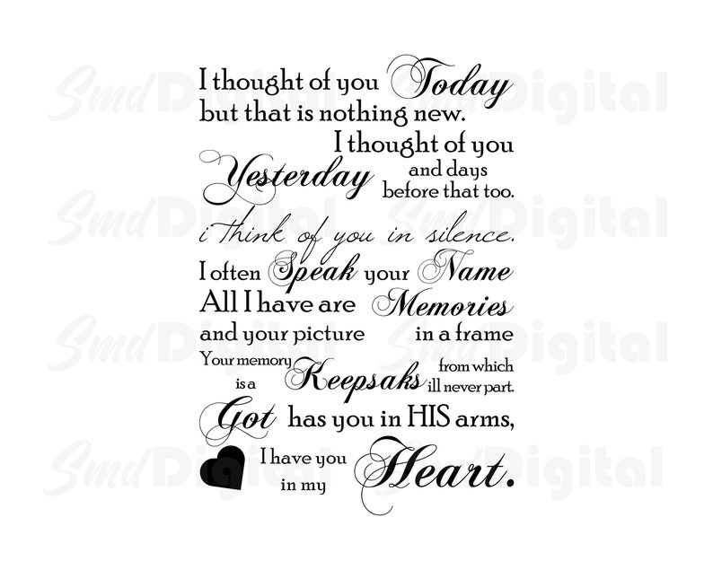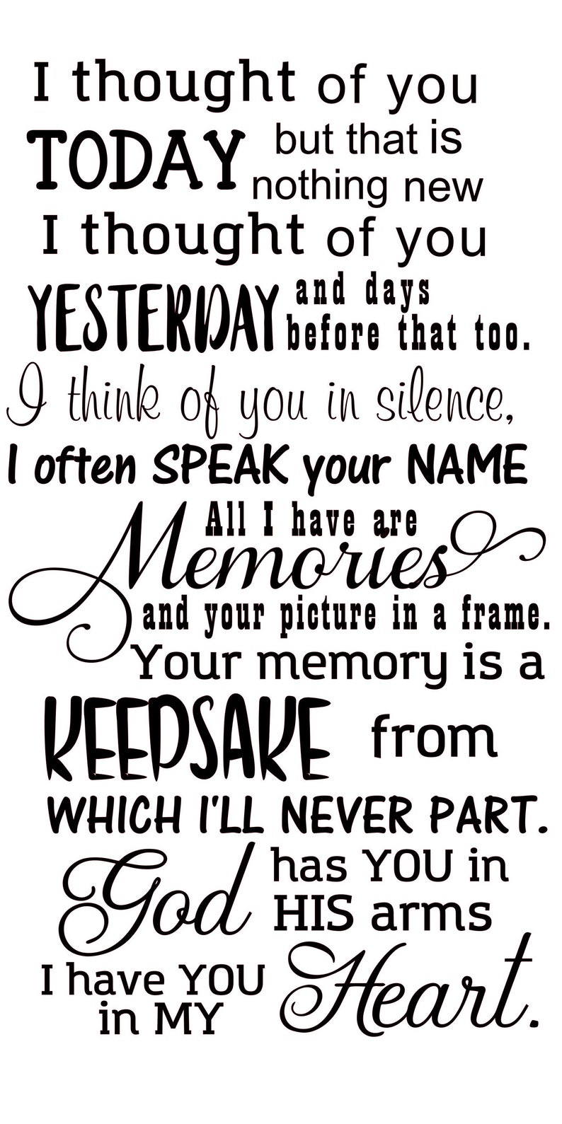 I thought of you today, but that is nothing new. I thought about you yesterday and days before that too. I think of you in silence, I often speak your name. All I have are memories and your picture in a frame. Your memory is a keepsake from which I'll never part. God has you in His arms, I have you in my heart. Author Unknown