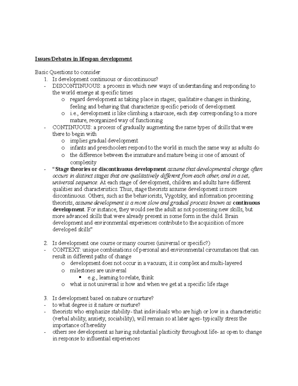 Exam 1 Notes (master) 5 lecture Issues/Debates in lifespan development Basic Questions to