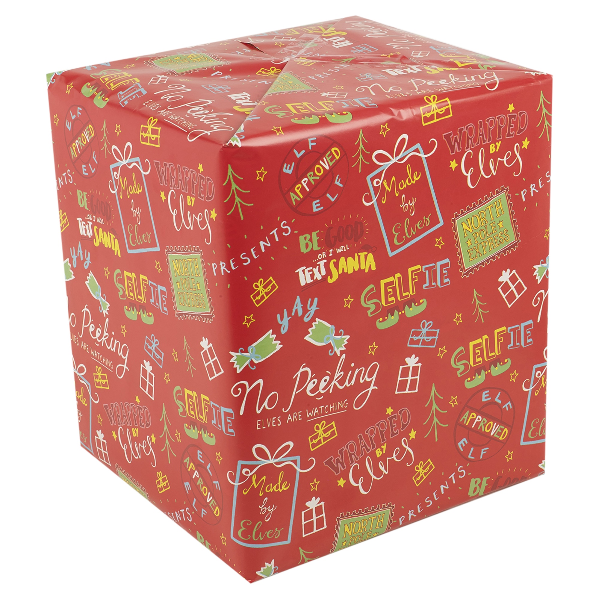 Heavyweight wrapping paper roll with bright, collage-style lettering on white. 90 sq. ft. roll; 40" W x 27' L. Premium gift wrap rolls include a cutting grid on reverse to ensure straight lines. Perfect for wrapping birthday presents for kids and adults throughout the year. Supersize roll wraps up to 27 shirt boxes. This gift wrap is recyclable.