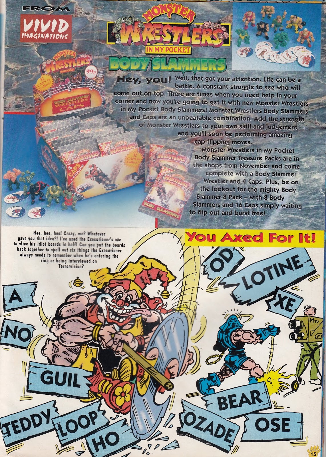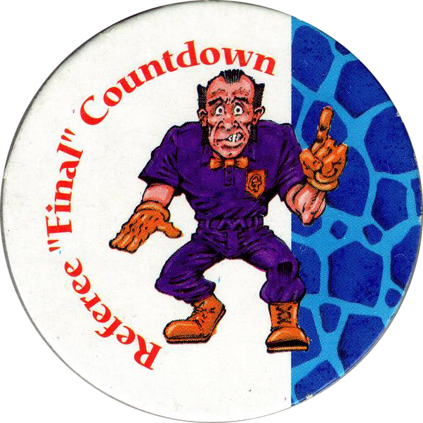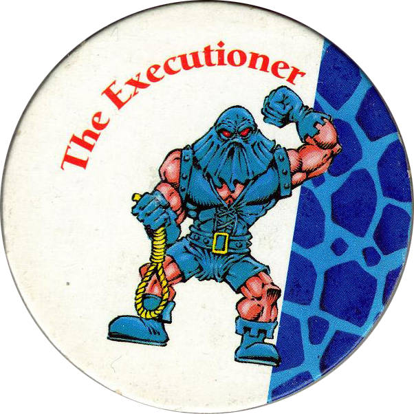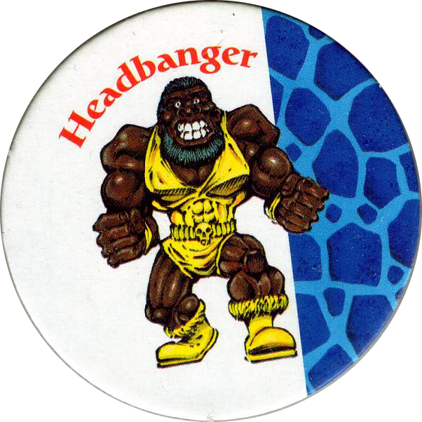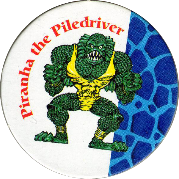 Info:Monster Wrestlers in my pocket was a series of toys sold by Vivid Imaginations during 1995. Each toy came with four Monster Wrestlers in My Pocket pogs. On the front of each pog it features a close-up of the character the pog came with. The back is printed in black and white and gives the Strength, Skill, and Brains point scores for the.