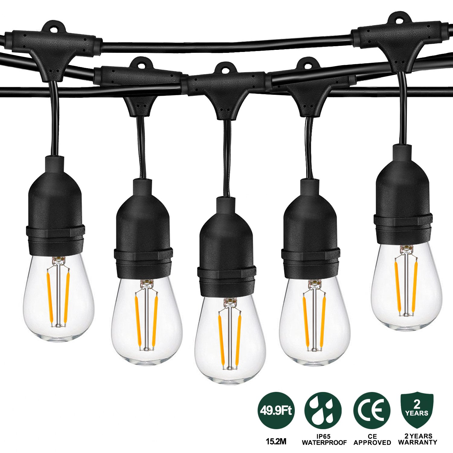 Bomcosy Outdoor Commercial Grade S14 LED String Lights 49.9Ft with 15 Hanging Dropped E27