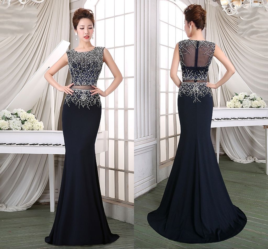 2017 New Navy Blue Prom Dress Fishtail Long Beaded Jewelry Elegant Sexy Sequin Evening Dress