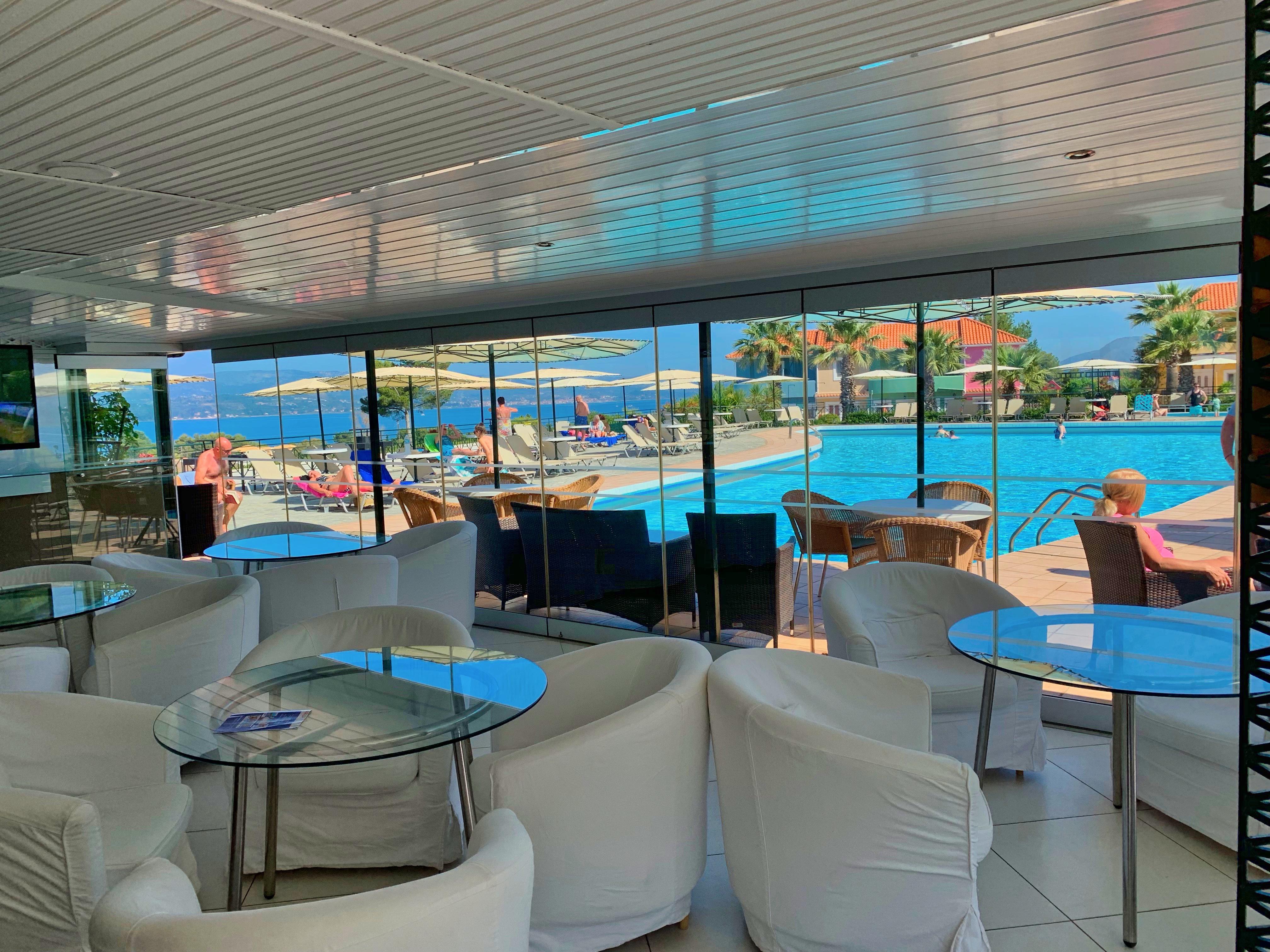 The San Lorenzo Village is situated on a small hill approx 150 metres from the main to the resort of Lassi . The complex comprise 7 two storey blocks,painted in a variety of different pastel shades surrounding the pool and bar/reception area . From what we could see all rooms are afforded excellent views of the pool and the bay area across to.