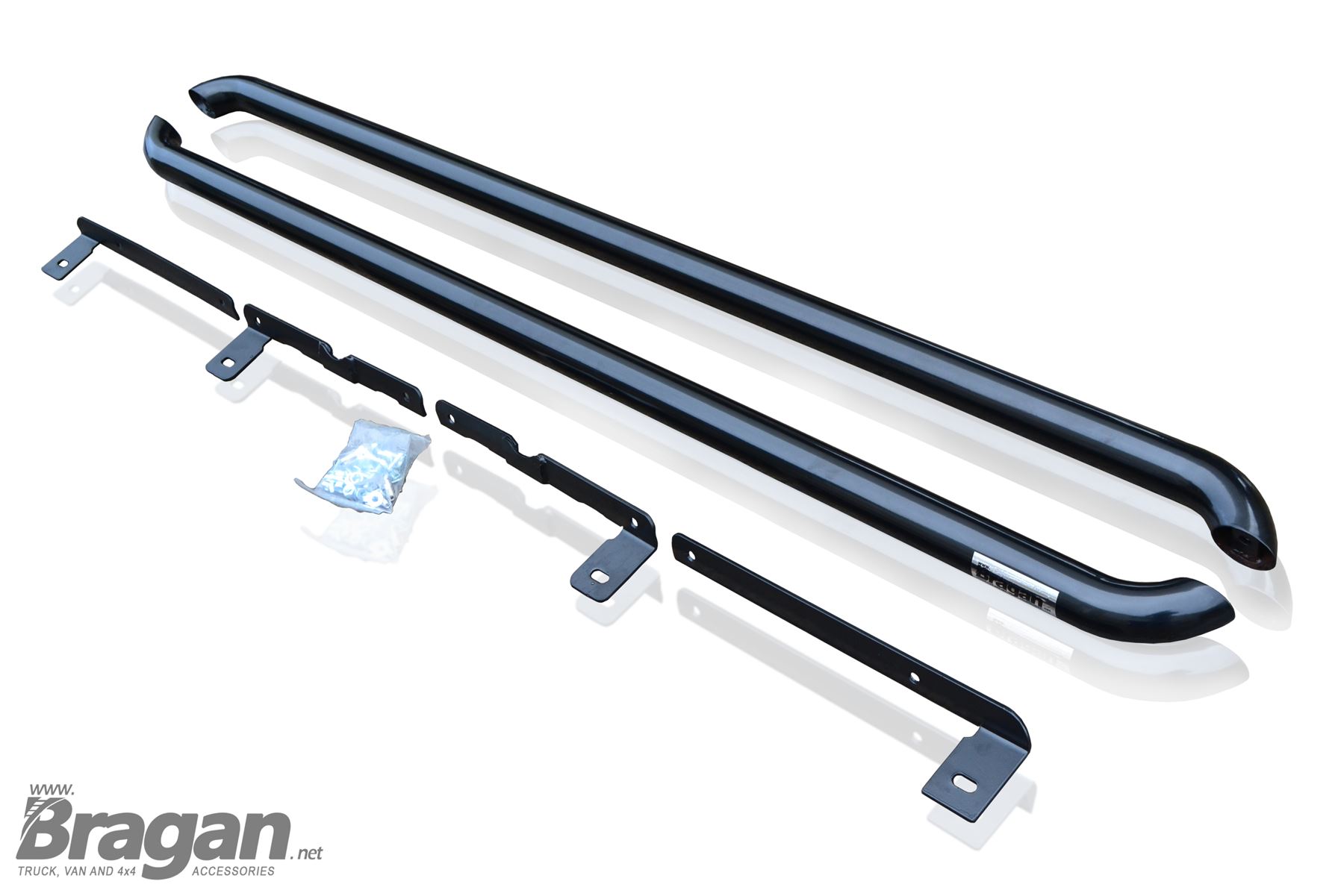 76mm Diameter Black Side Bars for the SWB VW Transporter T5 and T6 models. These side bars are designed to enhance your van and protect against scratches and bumps. Manufactured from grade T-304 marine quality stainless steel which is black powder coated for superior durability. Our large diameter side bars give a unique and stylish appearance.